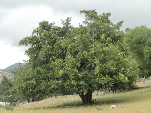 C'est sous la pluie entrecoupée d'éclaircies ensoleillées que nous nous préparons ce matin pour partir vers notre destination. Après avoir dit au revoir à Cathy et Roger, nous prenons la direction de Tafraout. Jusqu'à Tiznit, la route que nous choisissons est étroite, en mauvais état, souvent en travaux ou détériorée par les intempéries. Nous sommes contents car maintenant, le trajet qui serpente dans la montagne, est un vrai spectacle à chaque virage.